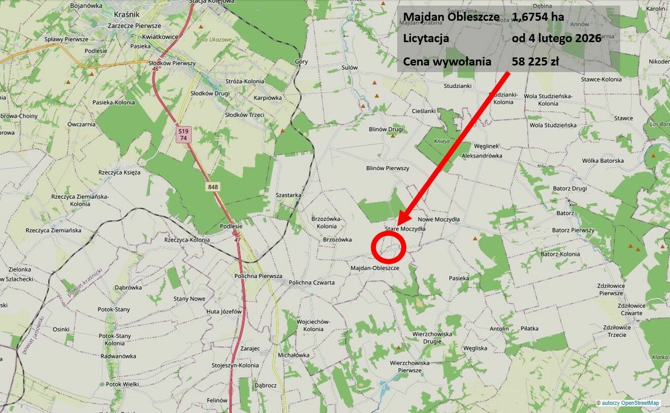 - nieruchomości położonej Majdan Obleszcze, 23-225 Szastarka, dla której Sąd Rejonowy w Kraśniku V Wydział Ksiąg Wieczystych (adres: ul. Fabryczna 6/23-204, Kraśnik, 23-204 Kraśnik) prowadzi księgę wieczystą